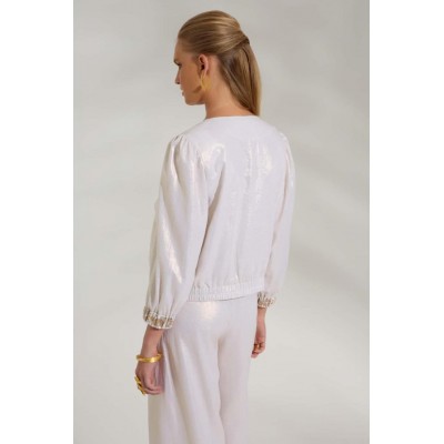 Ζακετάκι από 55% linen και 45% bamboo, σε άνετη γραμμή με λαιμόκοψη για κομψή εμφάνιση. Διαθέτει διακοσμητικά πατ μπροστά, πλαϊνές τσέπες και εντυπωσιακά μεταλλικά κουμπιά. Η υφαντή τρέσα Γαλλίας στα μανίκια προσθέτει μία ιδιαίτερη αίσθηση. Ιδανικό για chic καθημερινές εμφανίσεις.